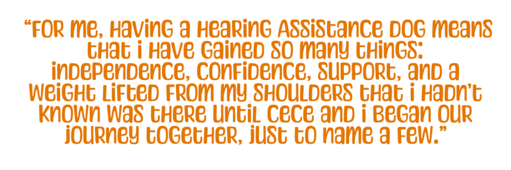 “For me, having a Hearing Assistance Dog means I have gained so many things: independence, confidence, support, and a weight lifted from my shoulders that I hadn’t even realised I was carrying until CeCe and I began our journey together.”