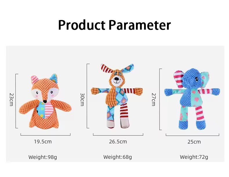 Choose from a plush Elephant, Fox or Puppy—perfect for your furry friend! Each toy features a squeaker and sound paper.