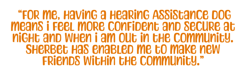 “For me, having a Hearing Assistance Dog means I feel more confident and secure at night and when I am out in the community. Sherbet has enabled me to make new friends within the community.”